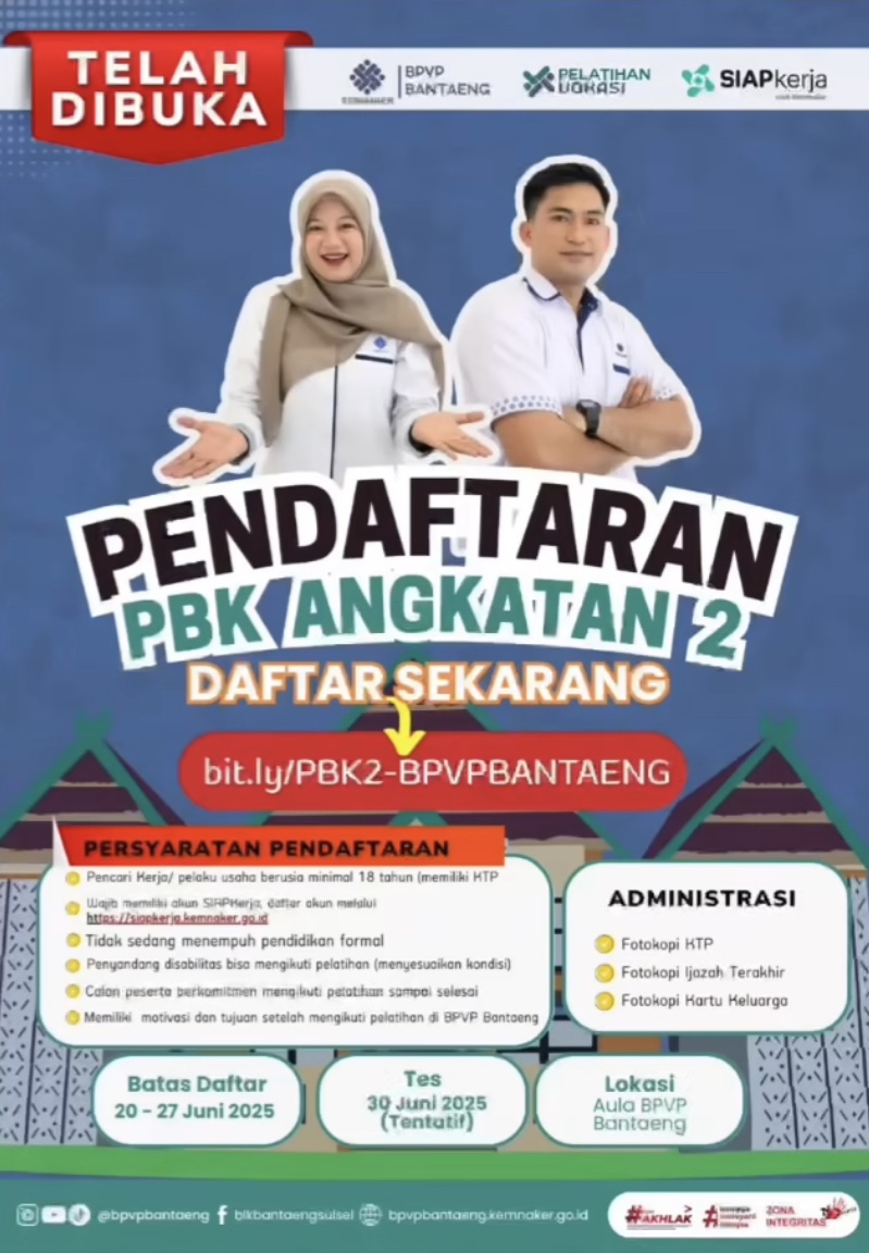Bantaeng, Targeticw.com – Kabar baik bagi masyarakat yang ingin meningkatkan kompetensi dan membuka peluang kerja! Balai Pelatihan Vokasi dan Produktivitas (BPVP) Bantaeng resmi membuka pendaftaran Pelatihan Berbasis Kompetensi (PBK) Angkatan 2. Pelatihan ini ditujukan untuk meningkatkan keterampilan kerja secara gratis bagi masyarakat umum. Sabtu, (21/06/2025).