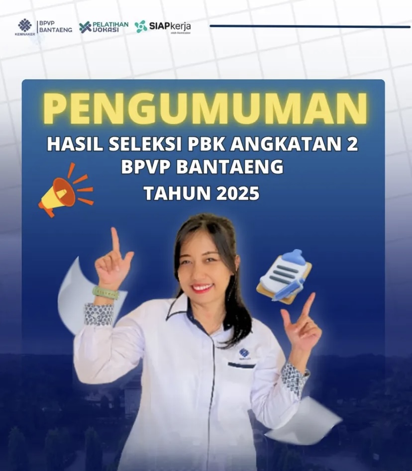 Bantaeng, Targeticw.com – Balai Pelatihan Vokasi dan Produktivitas (BPVP) Bantaeng resmi mengumumkan hasil seleksi Tahap 2 Program Pelatihan Berbasis Kompetensi (PBK). Para peserta yang dinyatakan lulus diminta segera melakukan daftar ulang untuk melanjutkan proses pelatihan yang akan datang. Kamis, (03/07/2025).