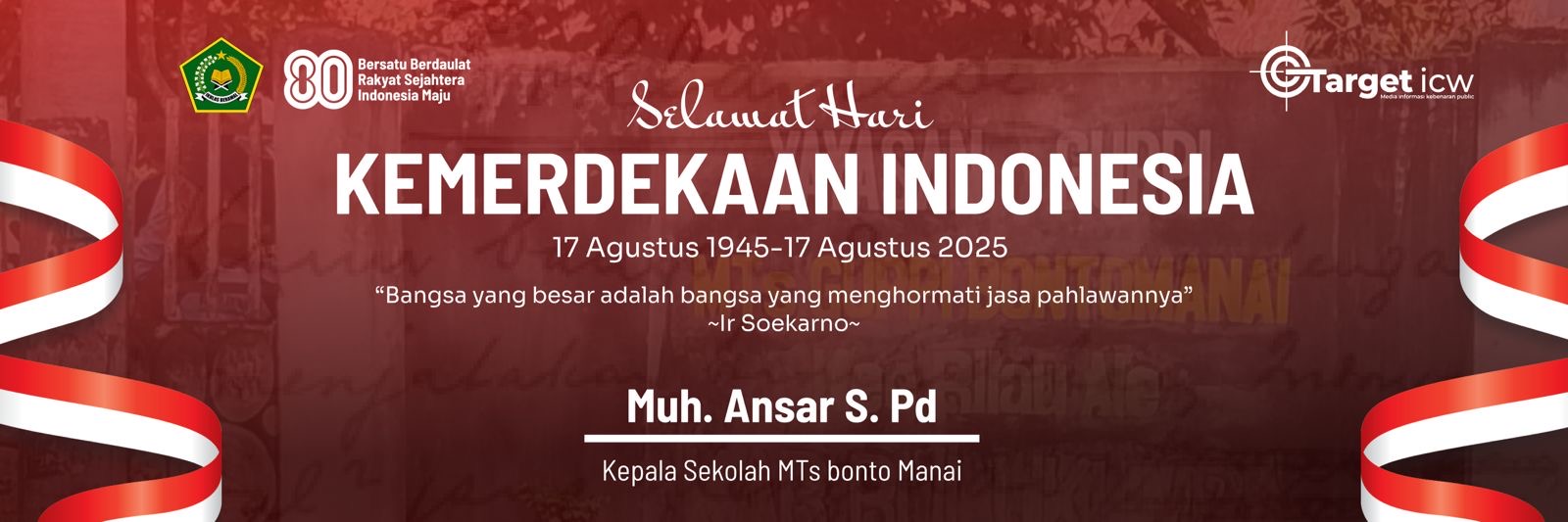 Bulukumba, Targeticw.com — Kepala Sekolah MTS Bontomanai, Muh Ansar, S.Pd Mengucapkan Selamat Hari Kemerdekaan Indonesia 17 Agustus 2025. “Bangsa yang besar adalah bangsa yang menghormati jasa pahlawannya” -Ir. Soekarno-