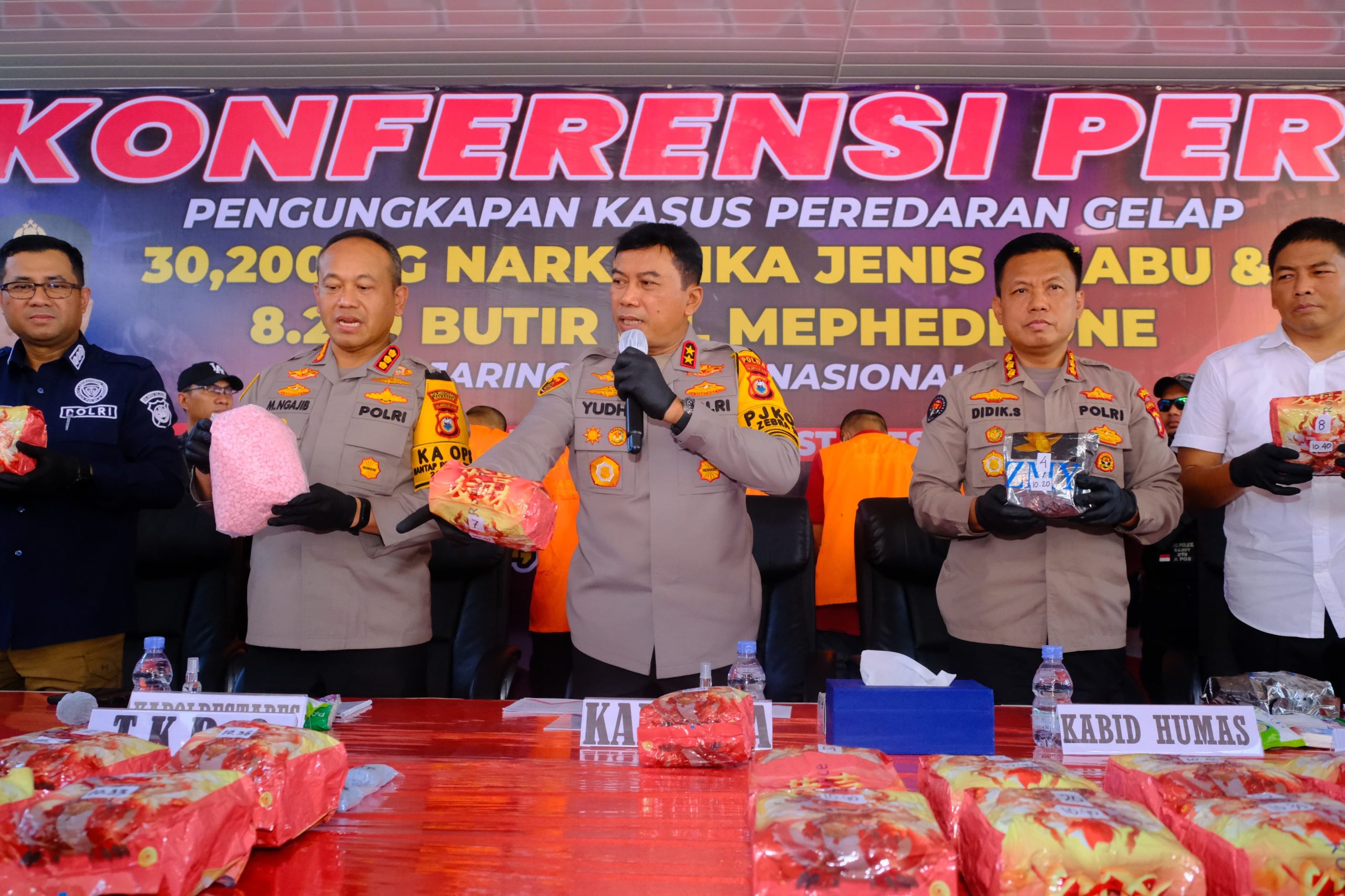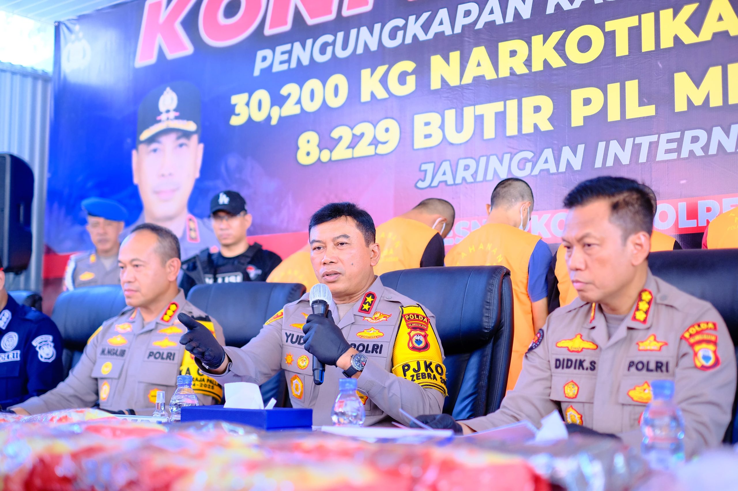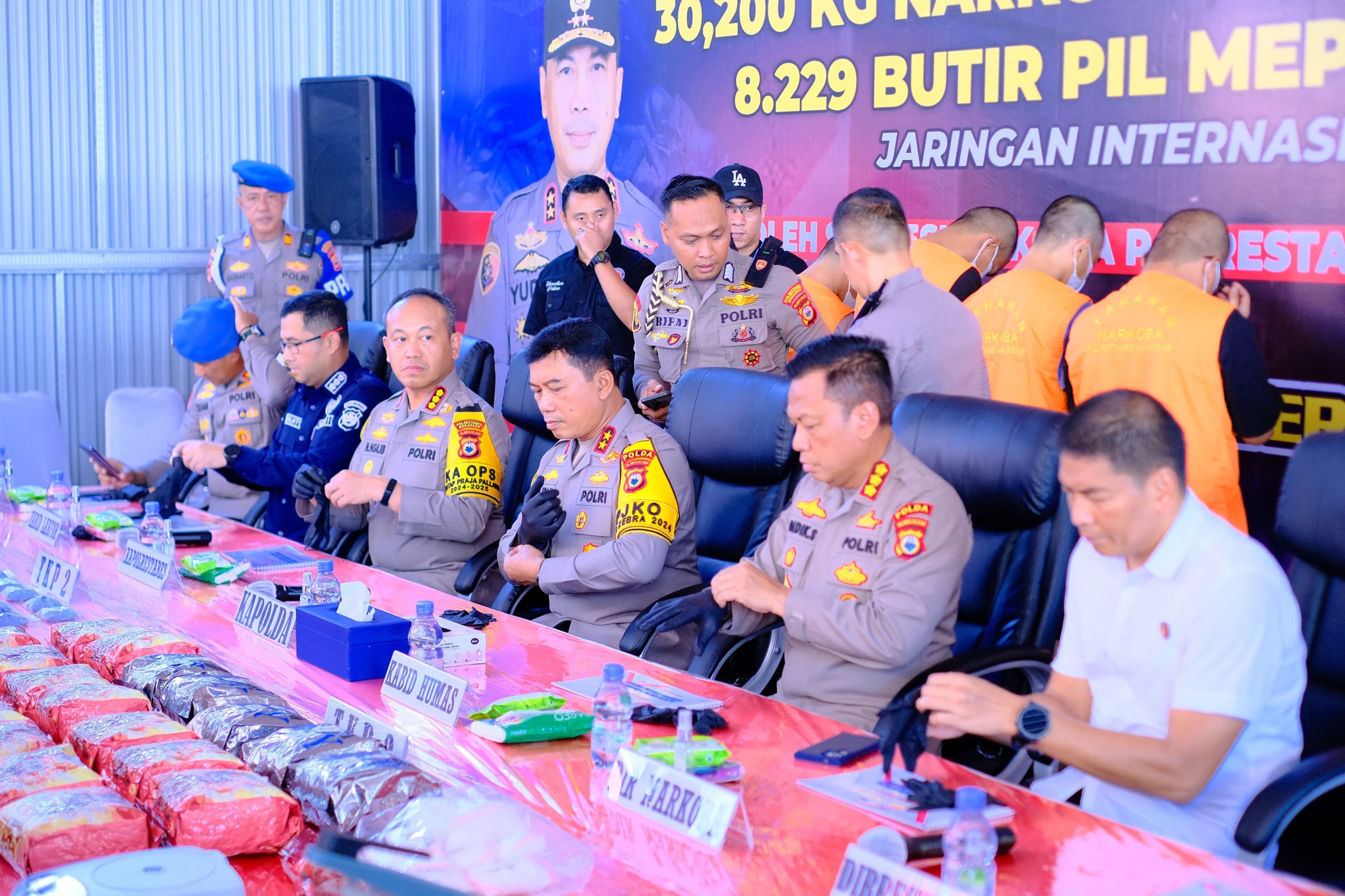 Kapolda Sulsel didampingi oleh Dir Reskrimum Polda Sulsel Kombes Pol. Jamaluddin Farti, S.I.K, M.Hum., Dir Resnarkoba Polda Sulsel Kombes Pol. Darmawan Affandy. S.I.K., MM., Kabidhumas Polda Sulsel Kombes Pol Didik Supranoto, S.I.K., M.H., Kabidlabfor Polda Sulsel Kombes Pol Wahyu Marsudi, S.Si., M.Si., Kabidpropam Polda Sulsel Kombes Pol Zulham Effendi S.I.K., M.H., serta Kapolrestabes Makassar Kombes Pol. Dr. Mokhamad Ngajib, S.I.K., M.H.