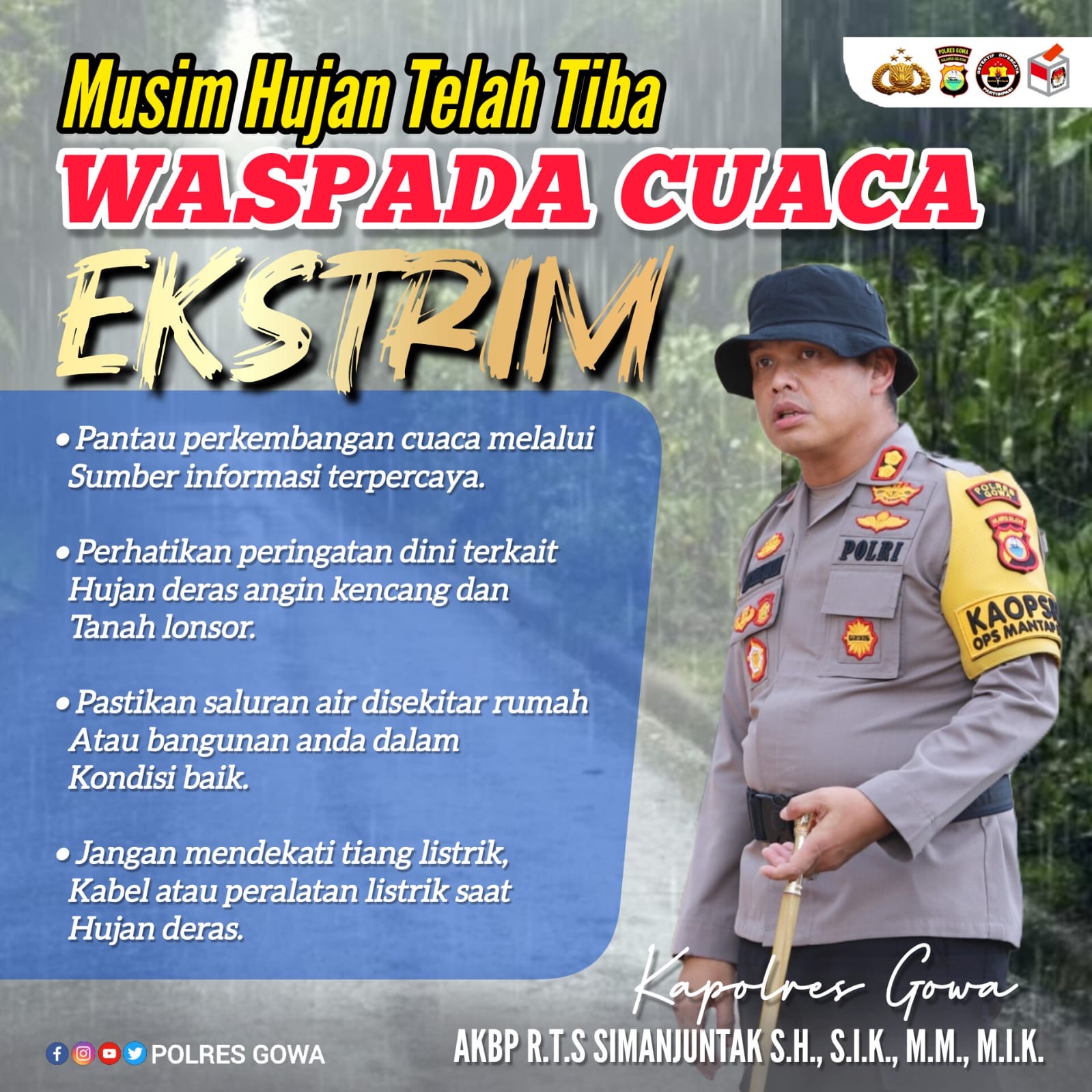 Gowa, Targeticw.com — Memasuki musim hujan, Kapolres Gowa AKBP R.T.S Simanjuntak, S.H., S.I.K., M.M., M.I.K., mengingatkan masyarakat untuk lebih waspada terhadap cuaca ekstrem yang berpotensi memicu bencana alam. Hal ini disampaikan, Jumat (06/12/2024) sebagai upaya untuk meningkatkan kesadaran dan kewaspadaan warga.