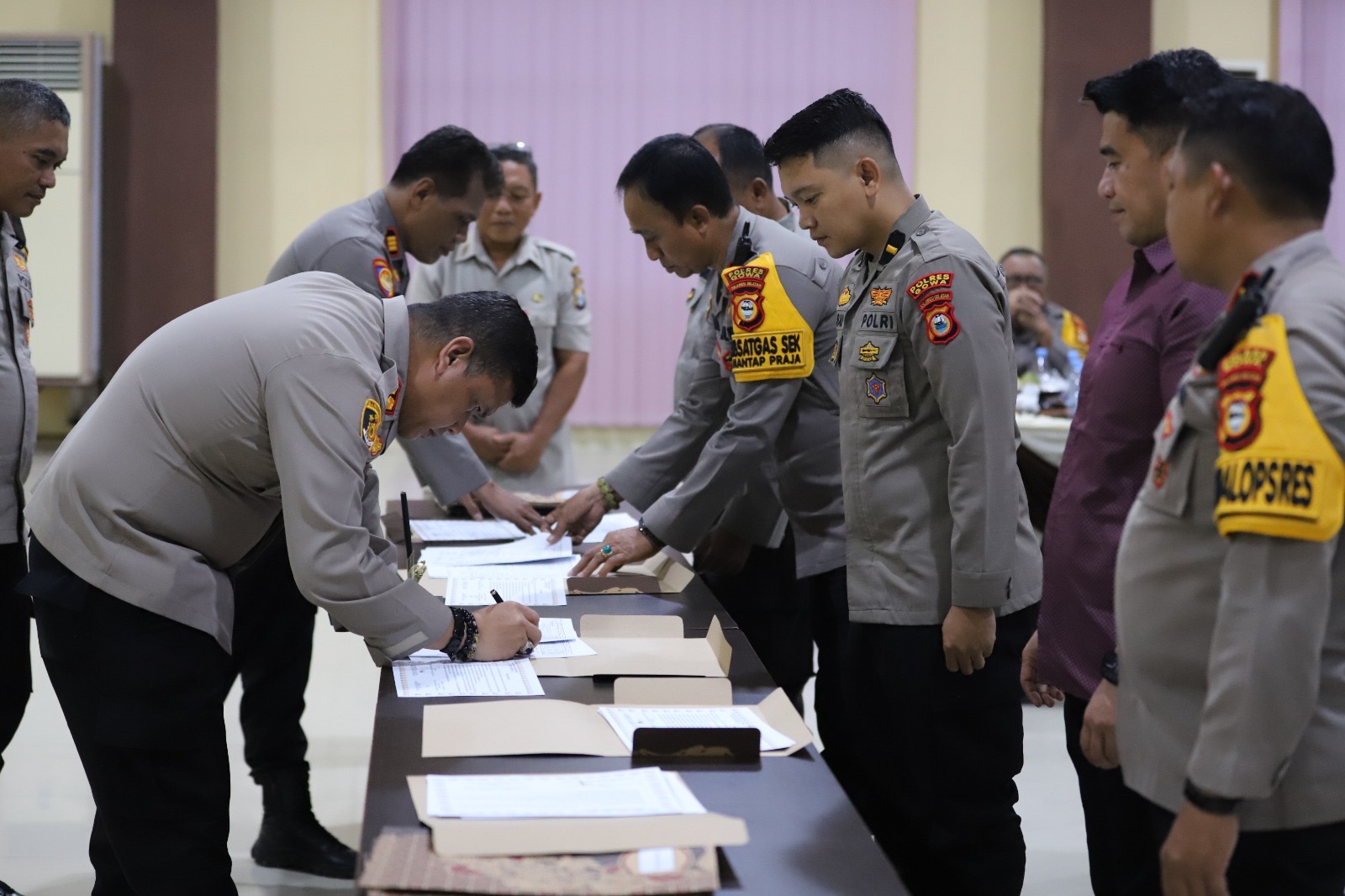 Selanjutnya, dilakukan penandatanganan Pakta Integritas oleh para pejabat sebagai bentuk komitmen bersama dalam mengelola anggaran secara transparan, akuntabel, dan profesional. Acara dilanjutkan dengan penyerahan dokumen alokasi anggaran secara simbolis oleh Kapolres Gowa kepada Kabag, Kasat, Kasi, dan Kapolsek jajaran.